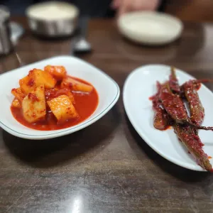 고추장아찌와 깍두기 등 반찬이 맛있어요.