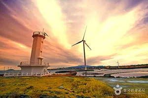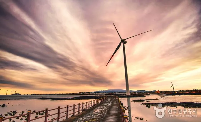 노을과 풍차가 어우러진 평화로운 해안 산책코스