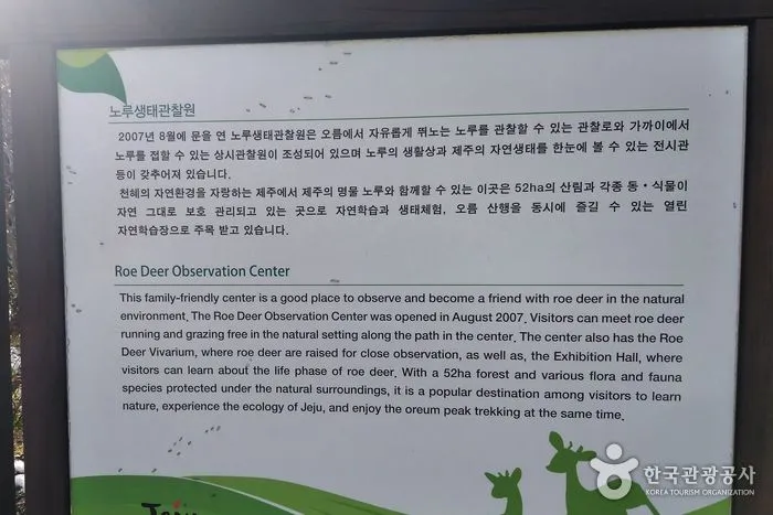 "푸른 자연 속에서 귀여운 노루와 교감하며 힐링 할 수 있는 공원" 제주도 노루생태관찰원은 울창한 숲속에서 자유롭게 뛰노는 야생 노루를 가까이에서 관찰할 수 있는 특별한 공간이에요. 50여 ha의 넓은 부지에 조성되어 있어 쾌적한 자연 환경 속에서 여유롭게 산책하며 노루의 생태를 관찰할 수 있답니다. 훼손되지 않은 자연 속에서 노루의 자연스러운 모습을 감상하며, 노루에게 먹이를 주는 체험이나 생태 교육 프로그램을 통해 자연과 더욱 가까워질 수 있어요. 한라산과 바다를 한눈에 담을 수 있는 탁 트인 전망이 자랑이에요. 숲길을 따라 걸으면서 몸과 마음을 정화하고, 자연이 주는 편안함을 만끽할 수 있는 좋은 장소죠. 관람 포인트로는 상시 관찰원에서 가까이에서 노루를 관찰할 수 있고, 영상 전시실에서는 노루의 생태에 대한 다양한 정보를 얻을 수 있어요. 또한, 자연 학습장에서 노루뿐만 아니라 다양한 동식물에 대한 정보를 접할 수 있어요. 제주도 노루생태관찰원은 단순한 동물원이 아니라, 자연과 인간이 공존하는 생태 교육의 장이에요. 자연을 사랑하고 생태에 관심이 많은 분들에게 특별한 경험을 선사할 거예요. 일상에서 벗어나 자연의 아름다움을 만끽하고, 노루와 교감하며 잊지 못할 추억을 만들어보세요! <from 텔코> 제주 노루생태관찰원은 2007년 8월 3일 개장하였다. 각종 동식물이 자연 그대로 보존된 52ha의 공간에 오름에서 자유롭게 뛰노는 노루를 관찰할 수 있는 숲길 관찰로와 관람객이 가까이에서 직접 노루를 만져보고 먹이 주기 체험을 할 수 있는 상시관찰원이 조성되어 있다. 전시관에는 제주의 다양한 동식물과 한라산의 식생분포 등 제주의 자연에 대한 동물 이야기관과 노루의 특징, 역사 속에 나오는 노루의 기록 등 노루에 대한 지식을 제공하는 노루의 생태관, 노루의 생태와 생활상을 영상으로 보여주는 노루이야기 영상관이 있다. 천혜의 자연환경을 바탕으로 제주의 상징인 노루를 직접 관찰하고 휴식을 취하면서 노루에 대한 지식을 얻을 수 있는 노루생태관찰원은 자연학습과 생태체험을 동시에 즐길 수 있는 우리들의 공간이다. 거친오름 중턱을 따라 조성된 숲길 관찰로는 온 가족이 쉽게 이용할 수 있는 트래킹 코스로 약 40분이 소요되며 탁 트인 전망과 함께 자연속의 휴식공간을 제공한다. 노루생태관찰원에서는 노루먹이 주기 체험과 나무를 이용한 노루만들기 체험 등을 진행하고 있다. [출처: 한국관광공사]
